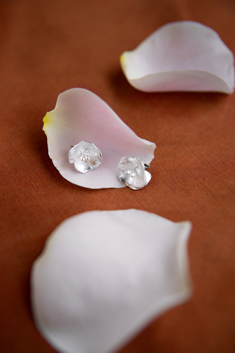 The frail beauty of midsummer roses blooms in the small Summer Night Rose silver earrings. Stud fastening. The earrings are not mirror images of each other. Also available in bronze.