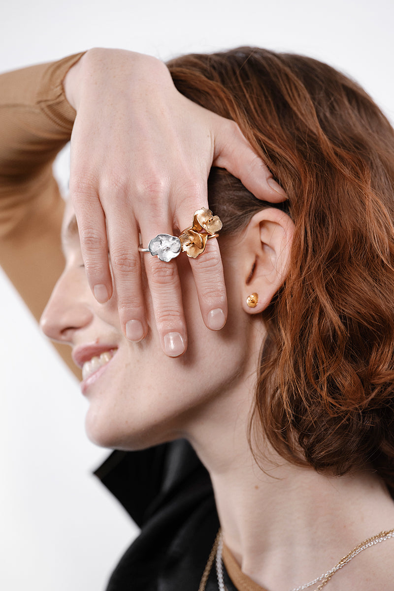 Juhannusruusujen herkkä kauneus puhkeaa kukkaan veistoksellisessa Kesäyön ruusu -pronssisormuksessa. Sormusta tehdään kolmessa halkaisijakoossa (S, M, L). Avointa sormusrunkoa avartamalla tai supistamalla voit säätää sormuksen juuri sinun sormeesi sopivaksi. Ethän kuitenkaan taivuttele sormusta edestakaisin – toistuvasta auki-kiinni -liikkeestä sormuksen runko väsyy ja voi lopulta katketa. Saatavissa myös hopeisena.