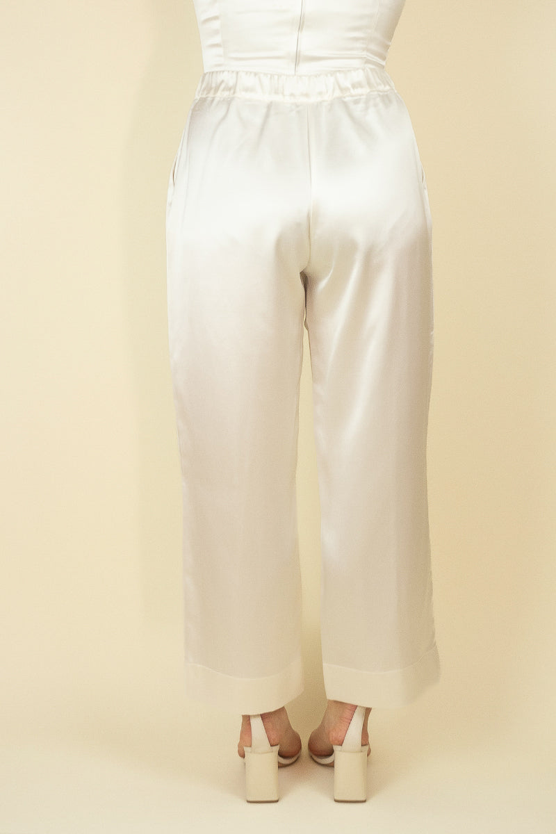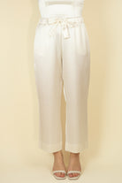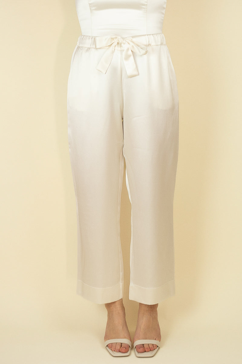 Silkkihousut, joissa edessä säädettävät nauhat, jotka voidaan sitoa kauniiksi rusetiksi. Materiaali on ylellistä, painavaa silkkisatiinia.