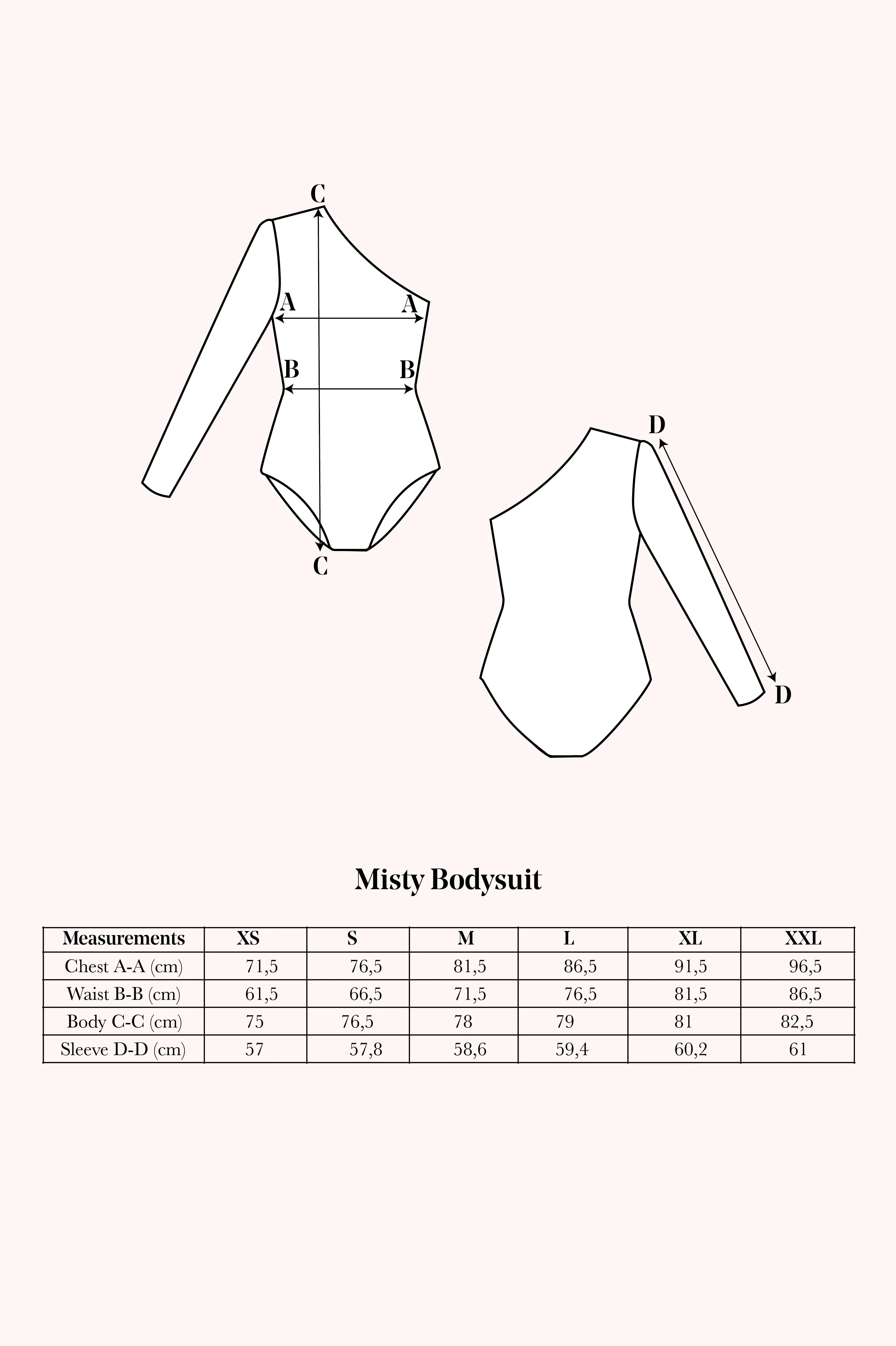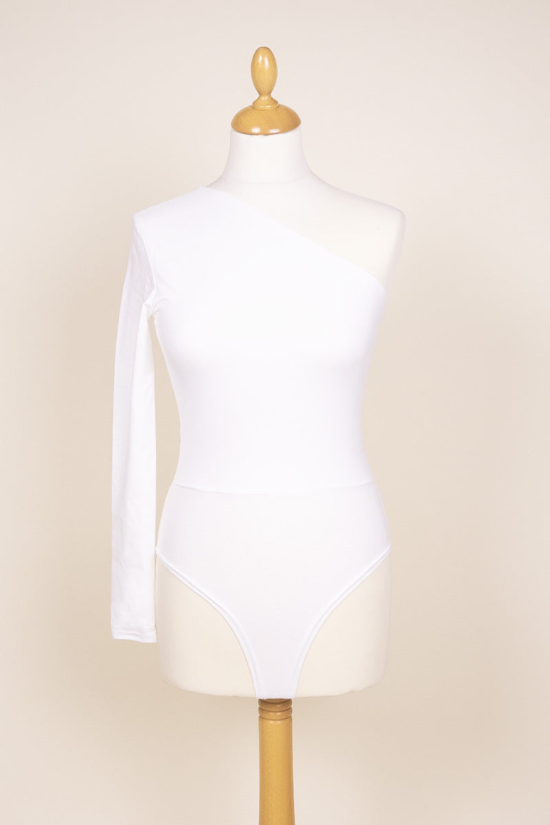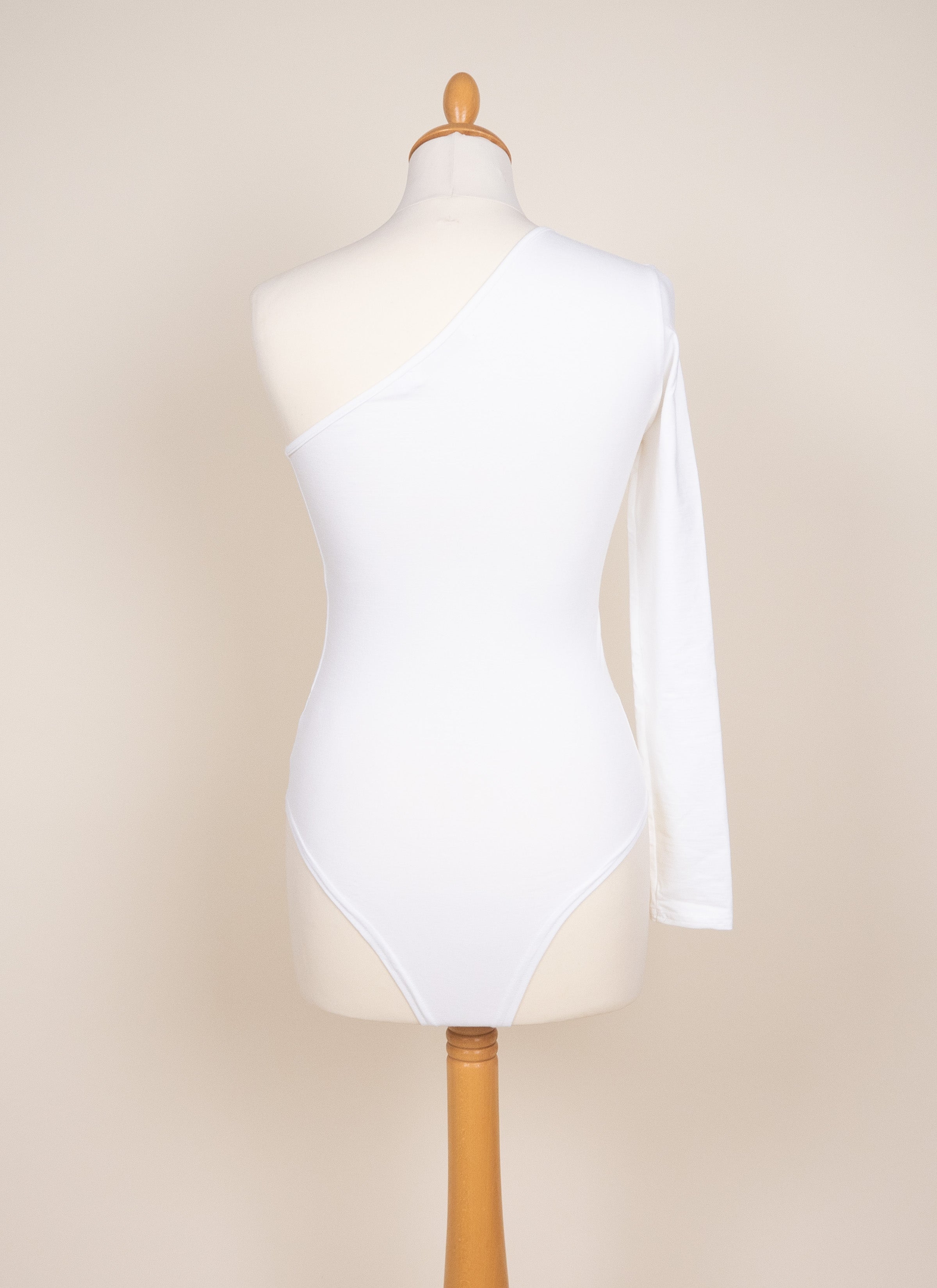 Pehmeä viskoosinen epäsymmetrinen bodysuit. Bodyn etuosa on kaksikerroksinen optimaalisen tuen takaamiseksi.