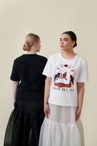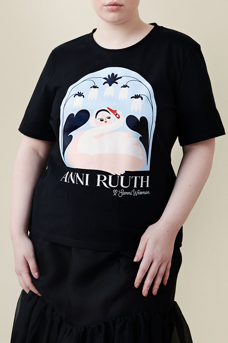 Esittelyssä Anni Ruuth <3 Sanni Wessman T-paita, kaunis yhteistyö taiteilija Sanni Wessmanin kanssa. Tässä pehmeässä, korkealaatuisessa luomupuuvillat-paidassa on upea Joutsen- ja balettiaiheinen kuvitus. Leveän ja hieman lyhennetyn pituuden ansiosta se on sekä tyylikäs että mukava. Valitse kahdesta vaihtoehdosta: Color Noir painovärillä Cloud tai väri Ivory painovärillä Blush. Täydellinen lisäämään ripauksen taidetta vaatekaappiisi.