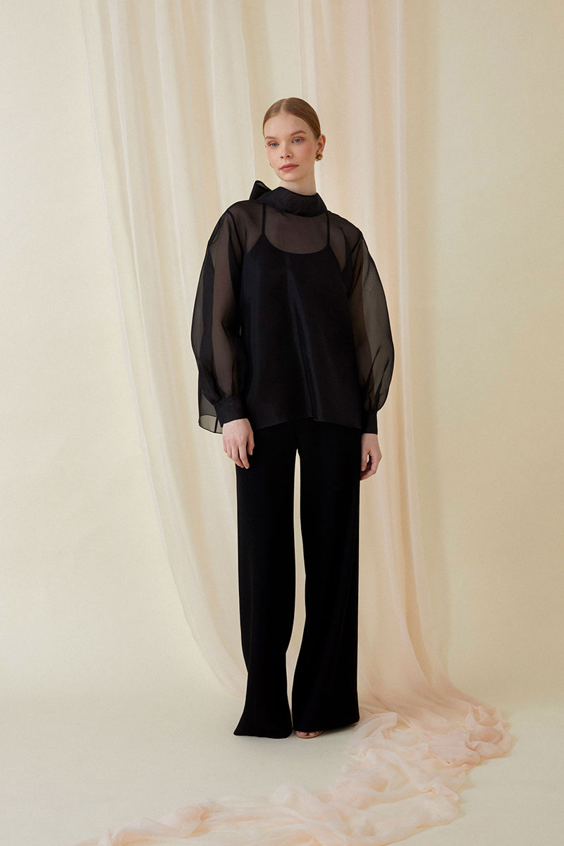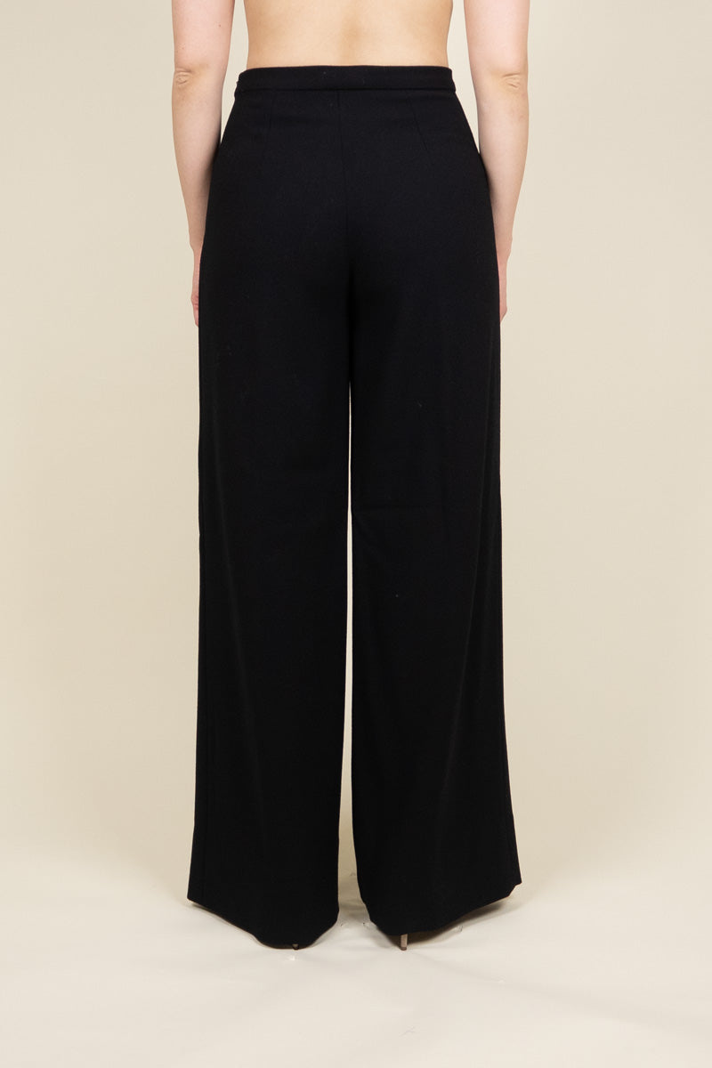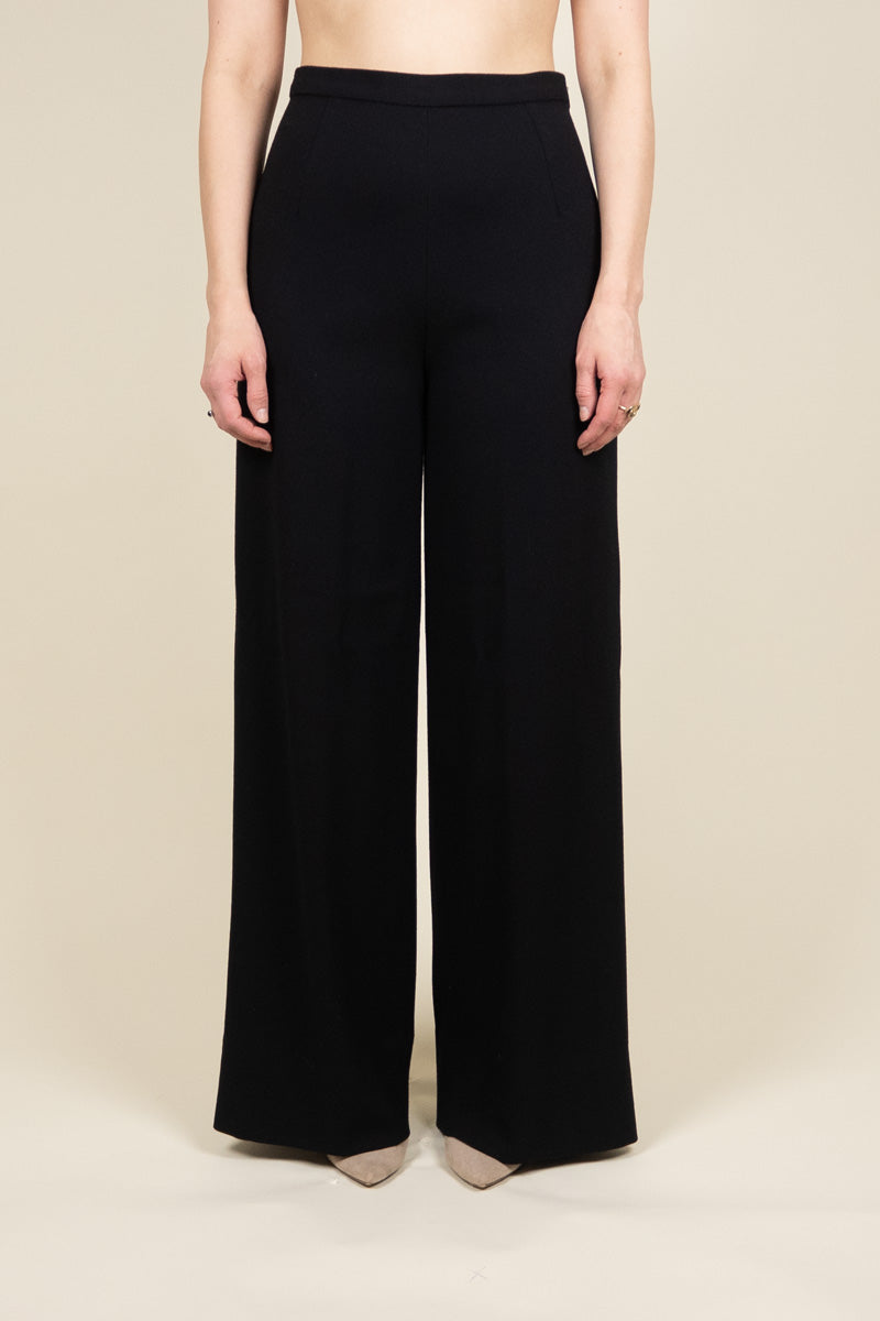 Wide leg trousers with high waist and light lining. The material is a soft Italian wool crepe that falls beautifully and stays smooth all day.