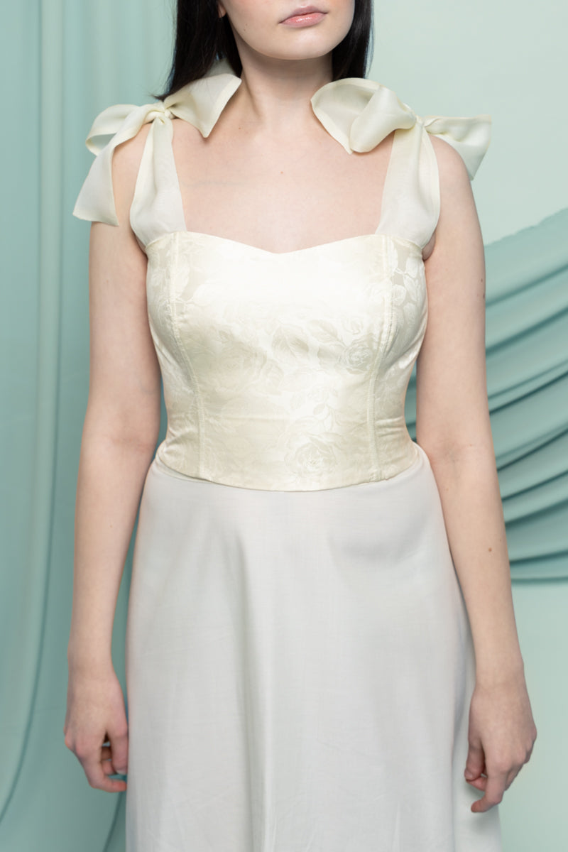 The bestselling corset from the Anni Ruuth Bridal collection is now presented in stunning surplus fabrics from Lili Marleena’s treasures. Each piece is unique, and this particular one is crafted from a beautiful, floral silk.